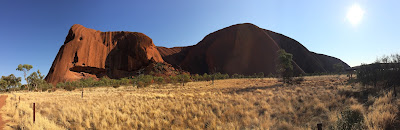 Then a flight to Uluru (indigenous name) / Ayres Rock (named after Sir Henry Ayres). The park was purchased by the government and sold to the indigenous peoples for $1 under the conditions that it be leased back to the government for 99 years and allow three generations of indigenous people to learn how to manage 300,000 visitors yearly. When I was there, park service staff was 38% indigenous and their goal was 50%. The housing near the park was closed and a resort 20 km from the park was built to reduce damage to the site. A cultural center was built. There's a cultural taboo about photographs of living and dead indigenous people. The only photos of indigenous people displayed were with explicit permission. When I was there it was strongly suggested that people don't climb Uluru and climbing it will be banned for tourists starting in 2019. One of the stories told to us was that hikers peeing and pooping on Uluru (no restroom facilities) led to contamination of watering holes at the base. Hotel room was nice or you can rough it by camping at the tent camp site and risk getting abducted by dingoes.